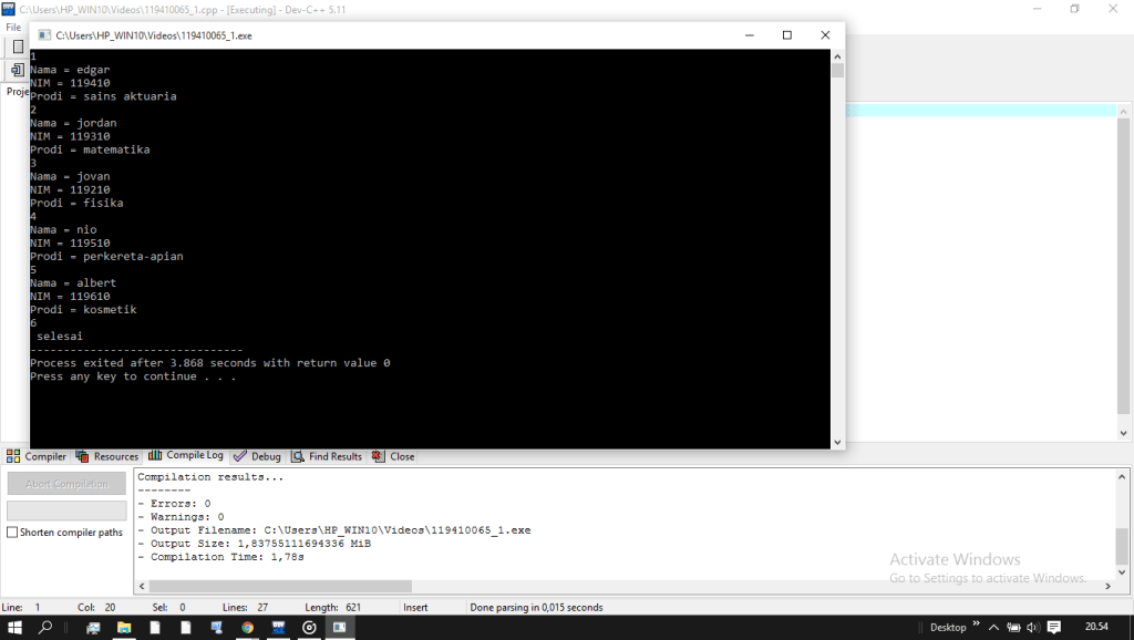 pada gambar diatas dapat dilihat saat kita memasukan nomor 1-5 akan keluar data masing-masing orang yang kita buat dan saat kita masukan angka 6 akan keluar tulisan selesai dan program kita pun terhenti.